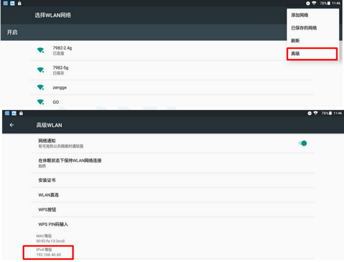 第四步:确定平板与电脑在同一局域网同一网段。可以通过平板WIFI管理高级设置看到当前连接的WIFI所分配的IP地址。